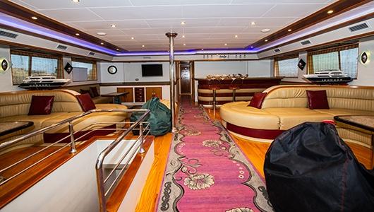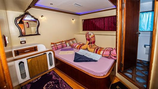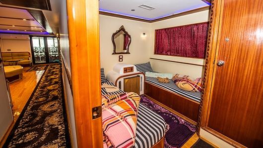 Na łodzi jest 14 kabin, rozmieszczonych na 3 pokładach. W tym 4 na pokładzie dolnym, 8 na pokładzie głównym i 2 na pokładzie słonecznym. Wszystkie kabiny wyposażone są w łazienkę, klimatyzację i lodówkę. Każda kajuta posiada system klimatyzacji, lodówkę i łazienkę z prysznicem, umywalką i toaletą.