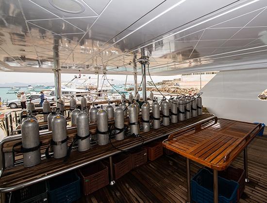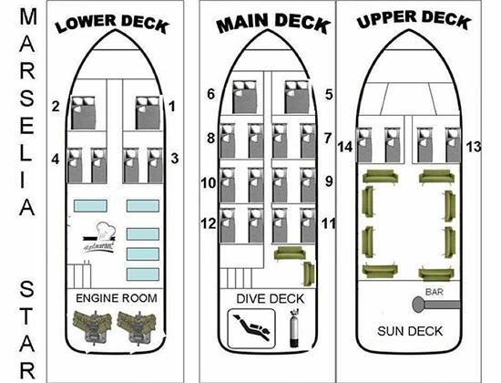 Łódź oferuje miejsce dla 28 nurków w 14 kabinach, z których wszystkie wyposażone są w łazienkę, klimatyzację i lodówkę. Ponieważ jadalnia i kuchnia znajdują się pod pokładem, na głównym i górnym pokładzie rozmieszczonych jest 10 kabin, w których znajdują się duże okna zapewniające więcej światła. Dwa salony oraz dwa pokłady słoneczne zachęcają do relaksu między nurkowaniami, wszystkie wyposażone są w kanapy i leżaki.
