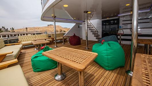 Idealnym miejscem na relaks między nurkowaniami są dwa pokłady słoneczne, wyposażone w leżaki, pufy i ławki. Do dyspozycji Gości jest również bar z zimnymi napojami i ekspres do kawy. Wysoki pokład zapewnia osłonę przed wiatrem, nawet w wietrzne dni.